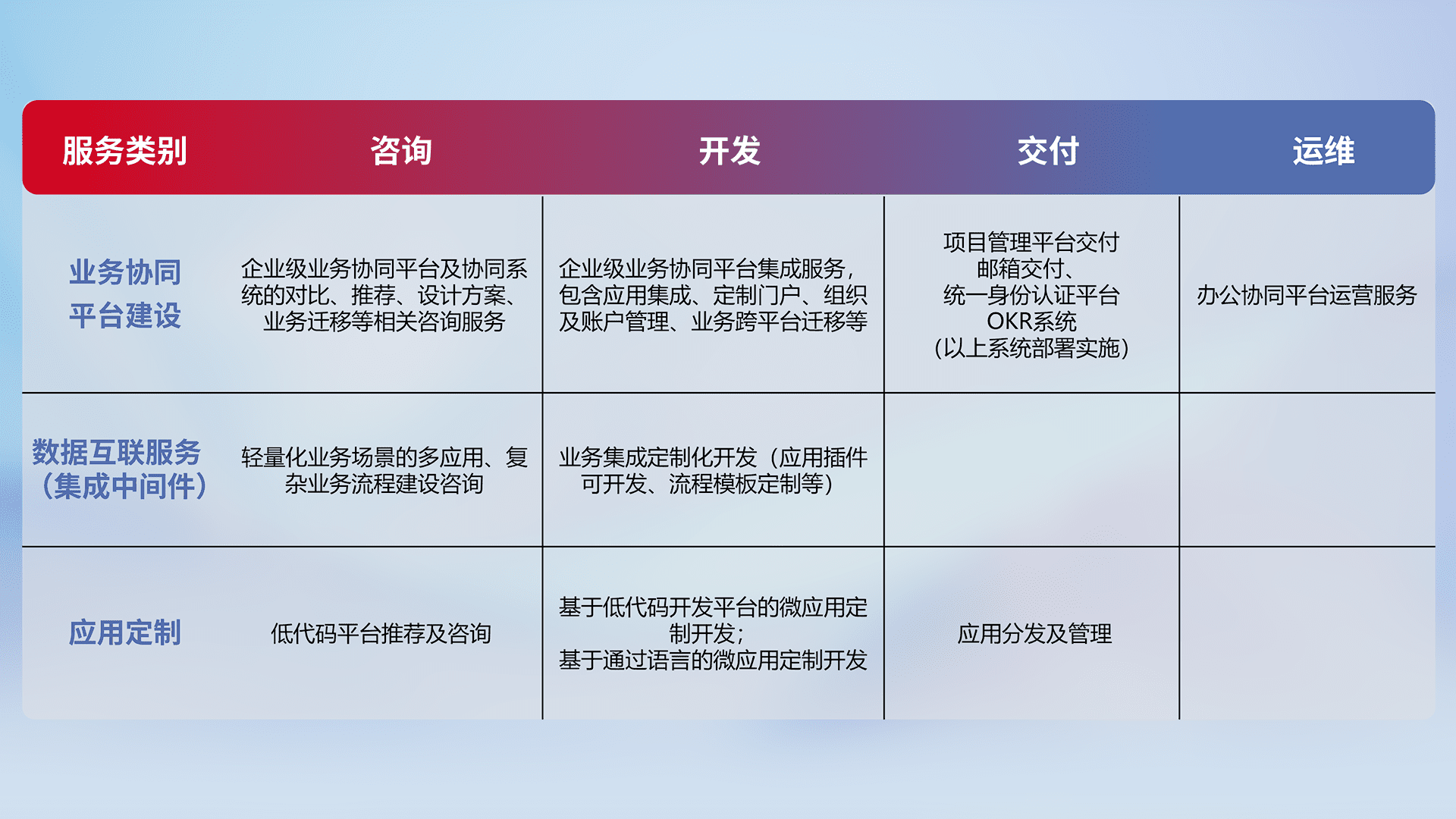 针对钉钉、、、、企微、、、、IDaas等平台级产品提供产品的规划、、、方案、、、、交付、、、、定制化开发等服务,,,,实现如统一协同办公、、、智能客户服务、、、、混合会议管理、、智能数据查询、、、、等业务场景,,,实现数字化转型。。。。